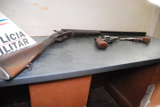 Dentro da casa os policiais encontraram uma espingarda calibre 32, um revólver calibre 38 e uma garrucha calibre 32. As armas não estavam documentadas como manda a lei e foram apreendidas. Humberto Eustáquio não tem passagens pela polícia e agora vai ter que responder por posse ilegal de arma de fogo.