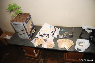 No interior da residência, os policiais encontraram 10 pedras de crack, um tablete de maconha, cerca de R$ 1.400,00 em dinheiro, dólares, aparelhos de telefone celular e um pé de maconha de aproximadamente 30 centímetros que estava sendo cultivado em uma lata de tinta.