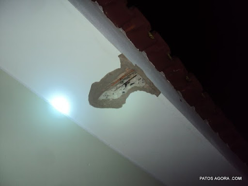 O casal foi até o quarto e viu um enorme buraco no teto e cama com um sinal de queimado do raio que caiu.