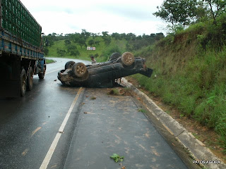 A caminhonete teria perdido o controle na curva e invadido a contramão de direção,subiu no barranco e capotou uma vez.